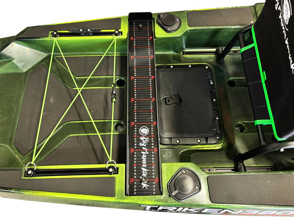 Kayak a pedali Triken 380 REV colore special army green - canoa monoposto fishing 4 portacanne, 2 gavoni, timone, sistema di pedali, sedile rialzato - big mama kayak