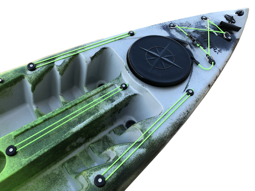 Inoltre il grande spazio a poppa permette di trasportare vari oggetti, zaino, borsa degli attrezzi e del pescato il tutto assicurato al kayak con cinghie lega carico.