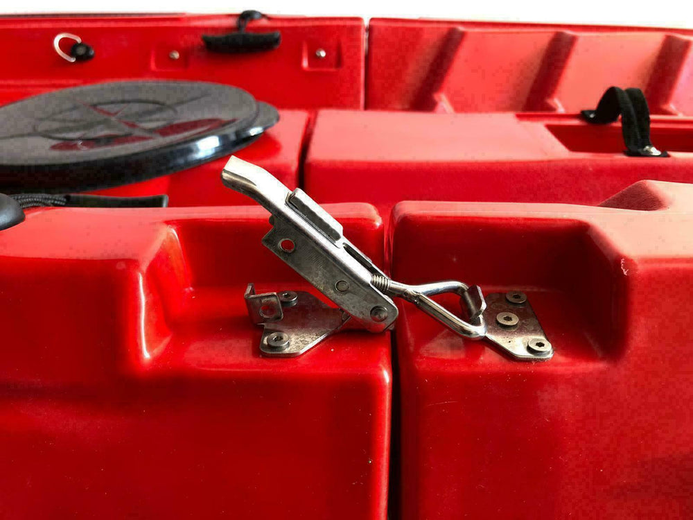 Il sistema di connessione tra i moduli è stato appositamente progettato per evitare sganci accidentali ed è dotato di 4 ganci in acciaio inossidabile per ogni modulo (senza l'uso di plastica). Questo metodo di aggancio permette di trasformare il kayak modulare in un unico pezzo. I test eseguiti con il kayak sospeso dimostrano una connessione perfettamente stabile.